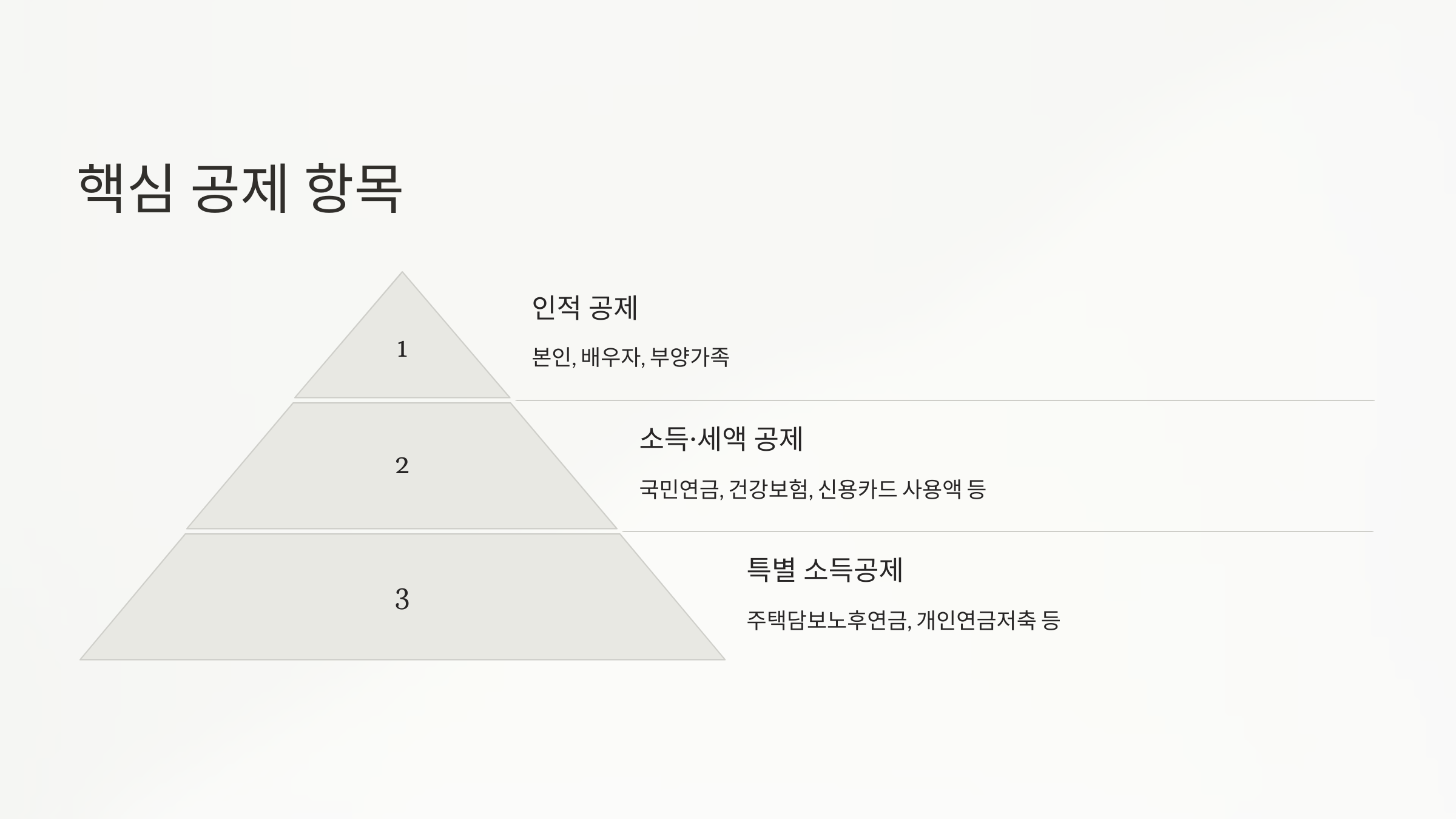 | 인적 공제 | 본인, 배우자, 부양가족 공제 | 부양가족 요건 꼼꼼히 확인, 누락 방지 |