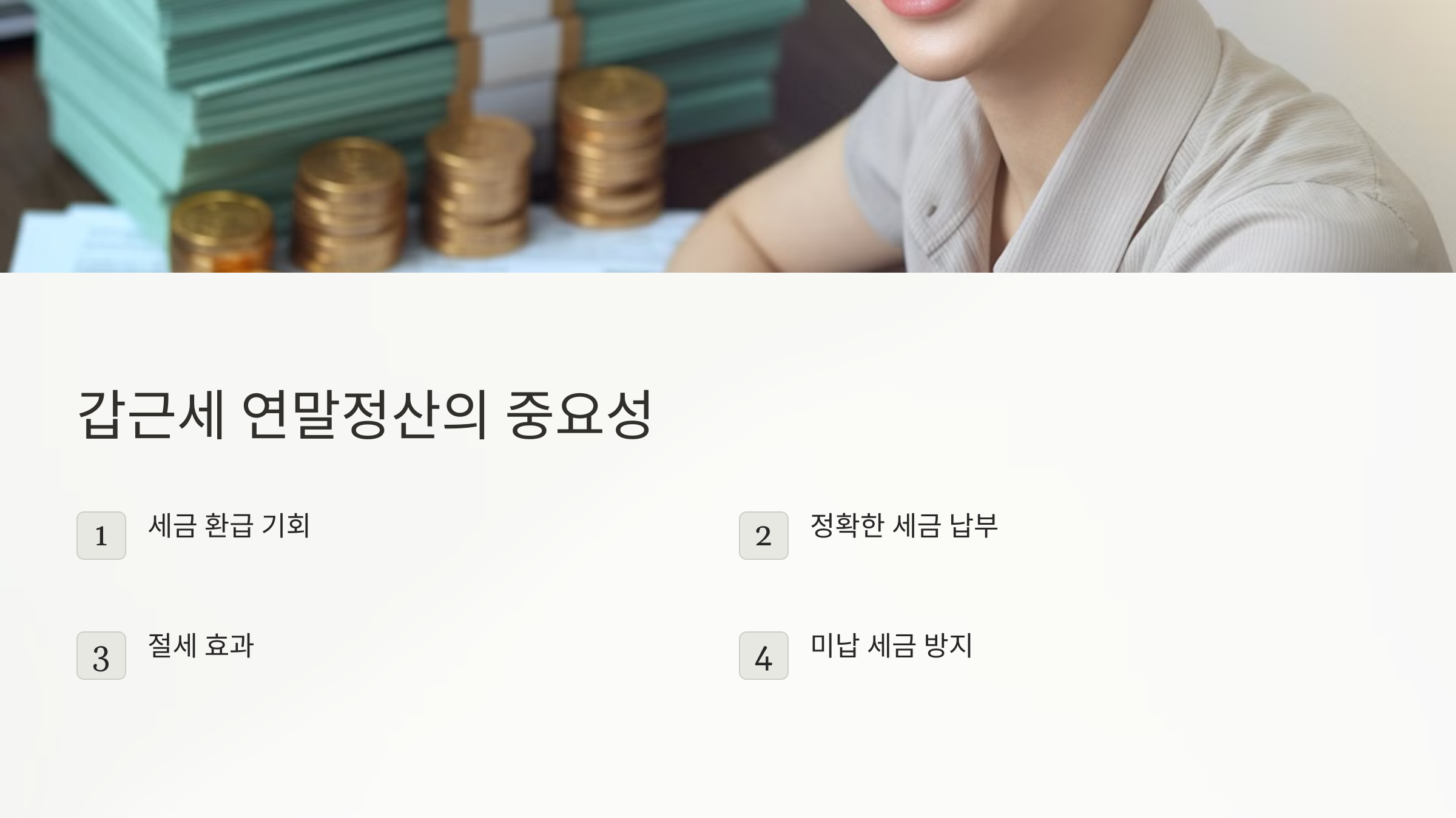 갑근세 연말정산은 복잡하지만, 꼼꼼히 준비하면 환급액을 최대한으로 늘릴 수 있습니다. 이 글에서 제시한 꿀팁들을 활용하여, 2025년 연말정산에서는 꼭 '세금 폭탄'이 아닌 '환급 보너스'를 받으시길 바랍니다. 혹시 과거에 놓친 공제 항목이 있다면, 지금이라도 경정청구를 통해 환급받을 수 있다는 점, 잊지 마세요!