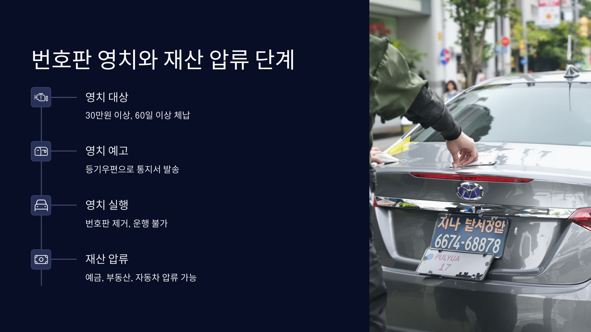 - 번호판 영치 실행: 예고 후에도 미납 시 차량 운행이 불가능하도록 번호판을 영치합니다. 번호판이 영치되면 차량 운행이 즉시 금지되며, 이를 어기고 운행할 경우 별도의 처벌을 받을 수 있습니다.