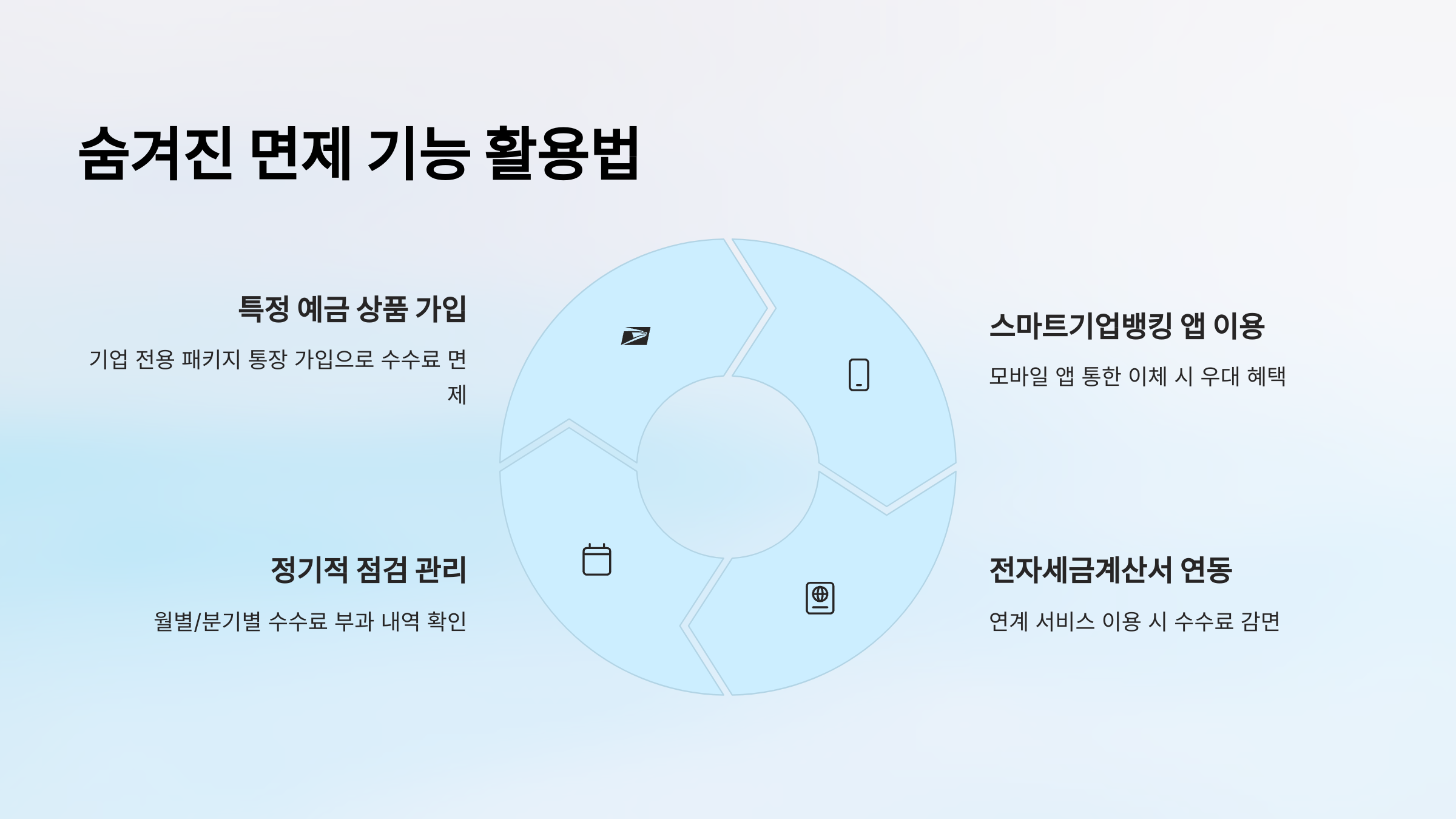 주거래 기업 우대 조건 외에도 농협 기업인터넷뱅킹 시스템 내에는 특정 서비스 이용이나 조건을 만족할 경우 수수료가 면제되는 '숨겨진' 기능들이 존재합니다. 이러한 조건들을 잘 파악하고 활용하면 추가적인 비용 절감이 가능합니다. 이는 은행이 디지털 채널 이용을 장려하거나 특정 상품 판매를 촉진하기 위한 마케팅적 요소가 포함된 경우가 많습니다.
