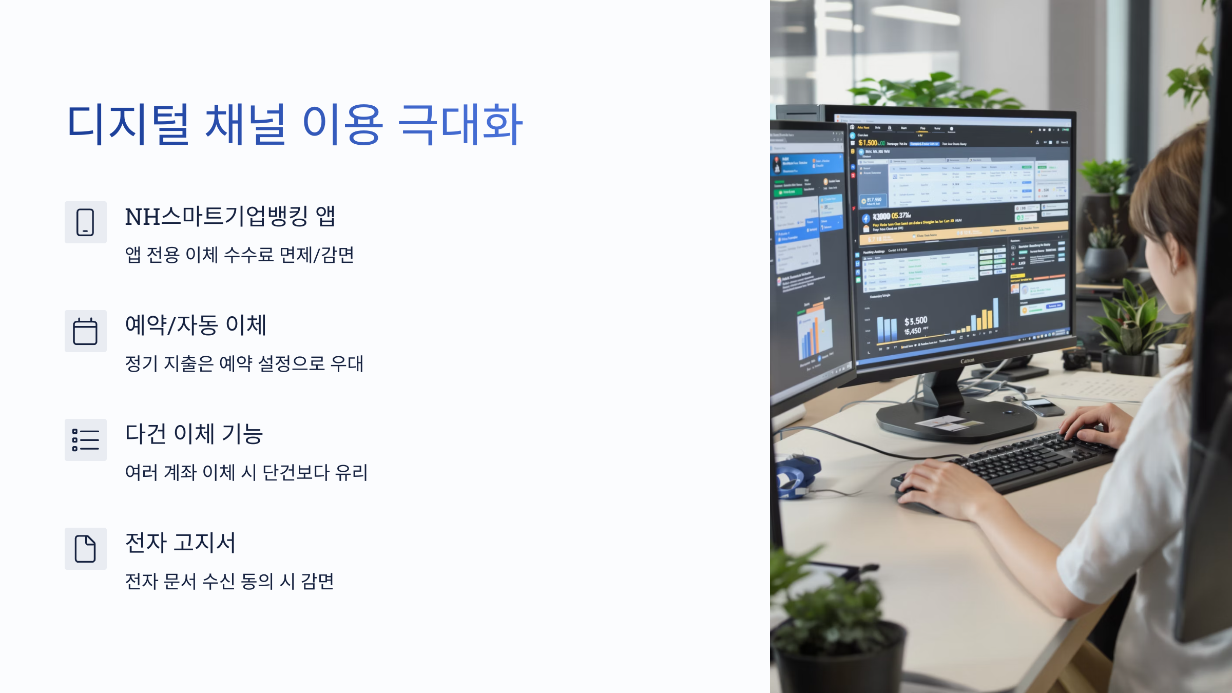 - NH스마트기업뱅킹 앱 적극 활용: 앱 전용 이체 수수료 면제/감면 혜택 확인 및 이용.