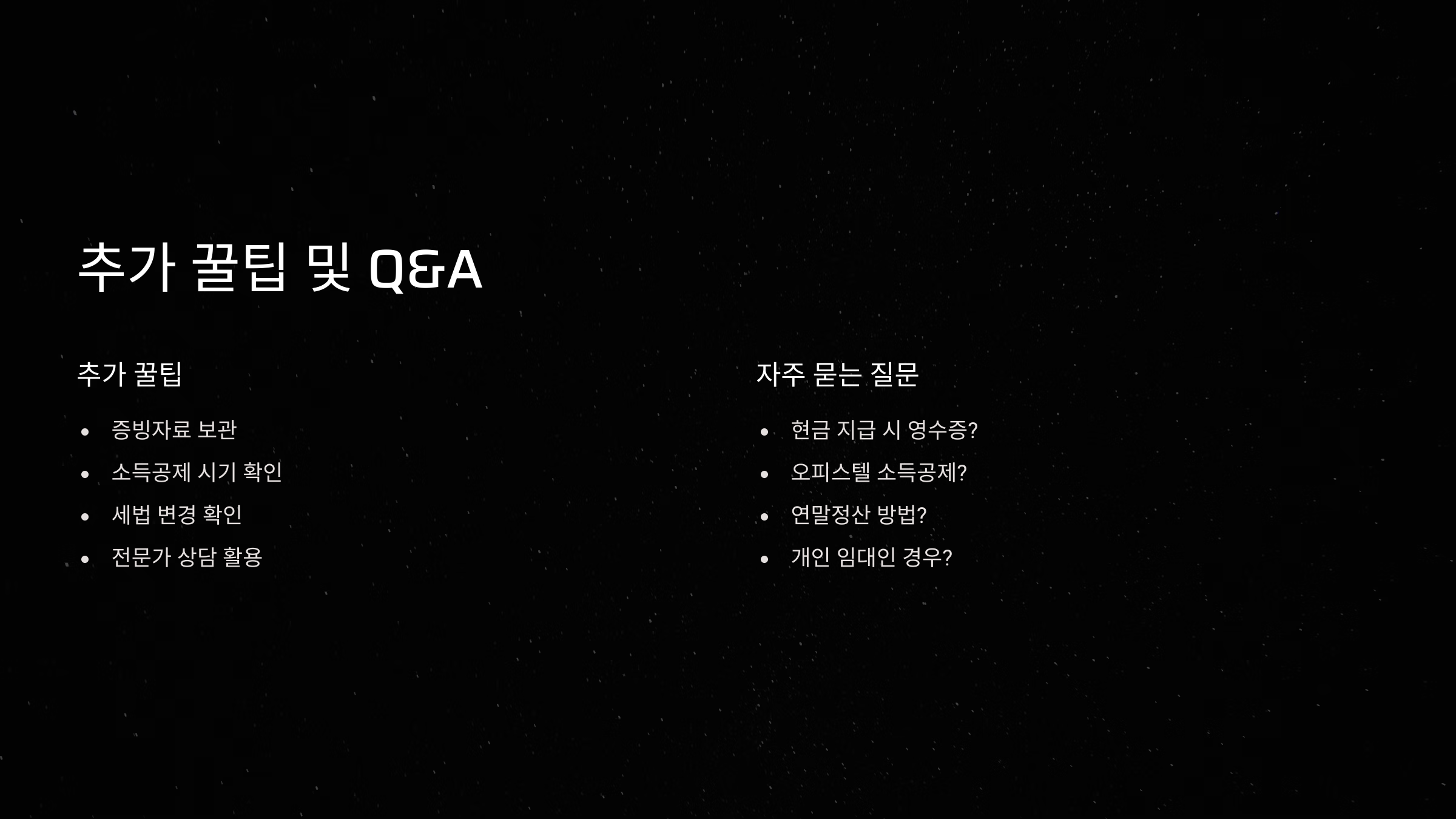 - 연말정산 또는 종합소득세 신고 시 관련 서류를 꼼꼼히 준비하여 세금 혜택을 놓치지 않도록 해야 합니다.