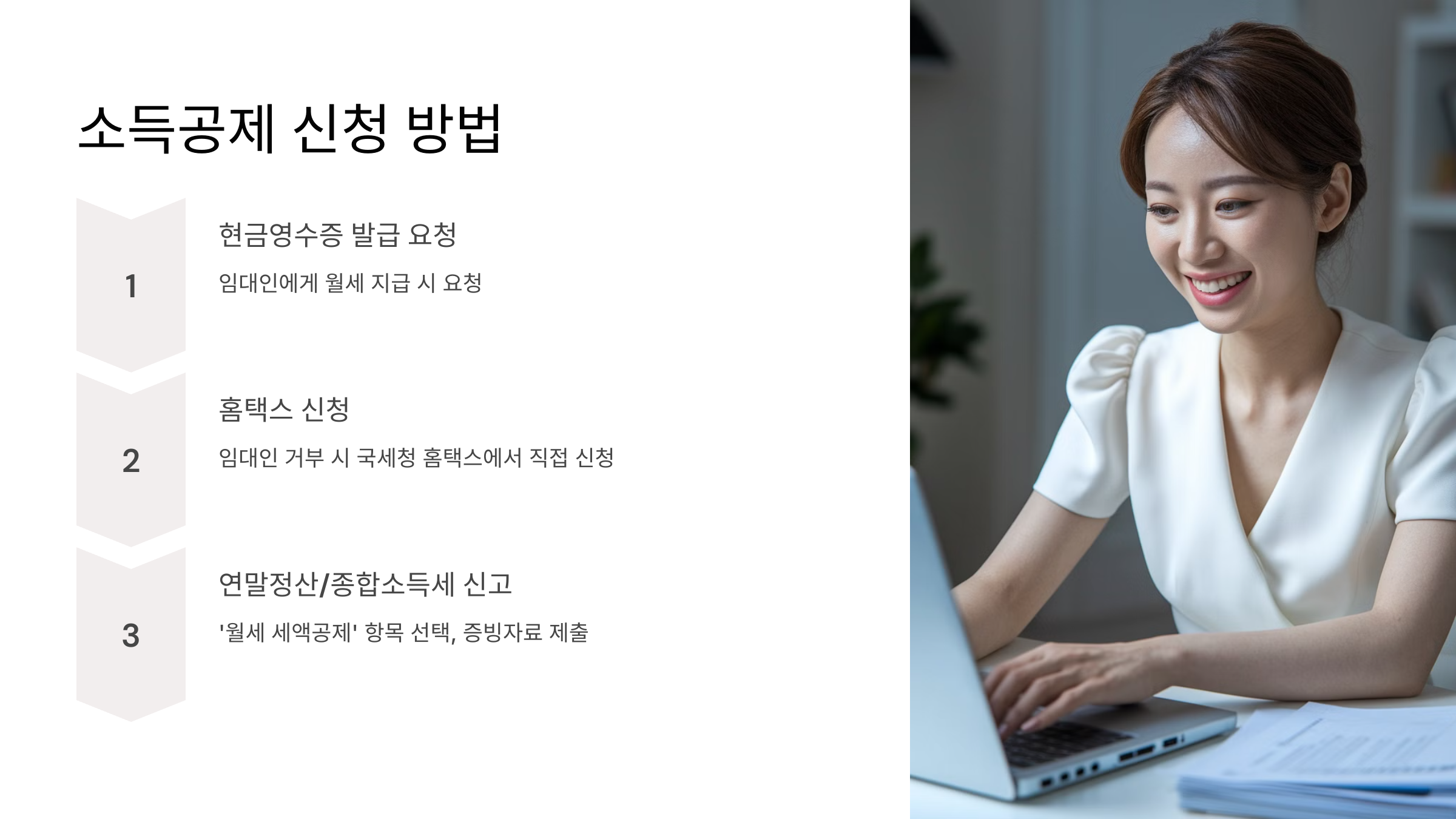 - 소득공제 신청: 연말정산 또는 종합소득세 신고 시 월세 지급 내역을 소득공제 항목으로 신청해야 합니다.