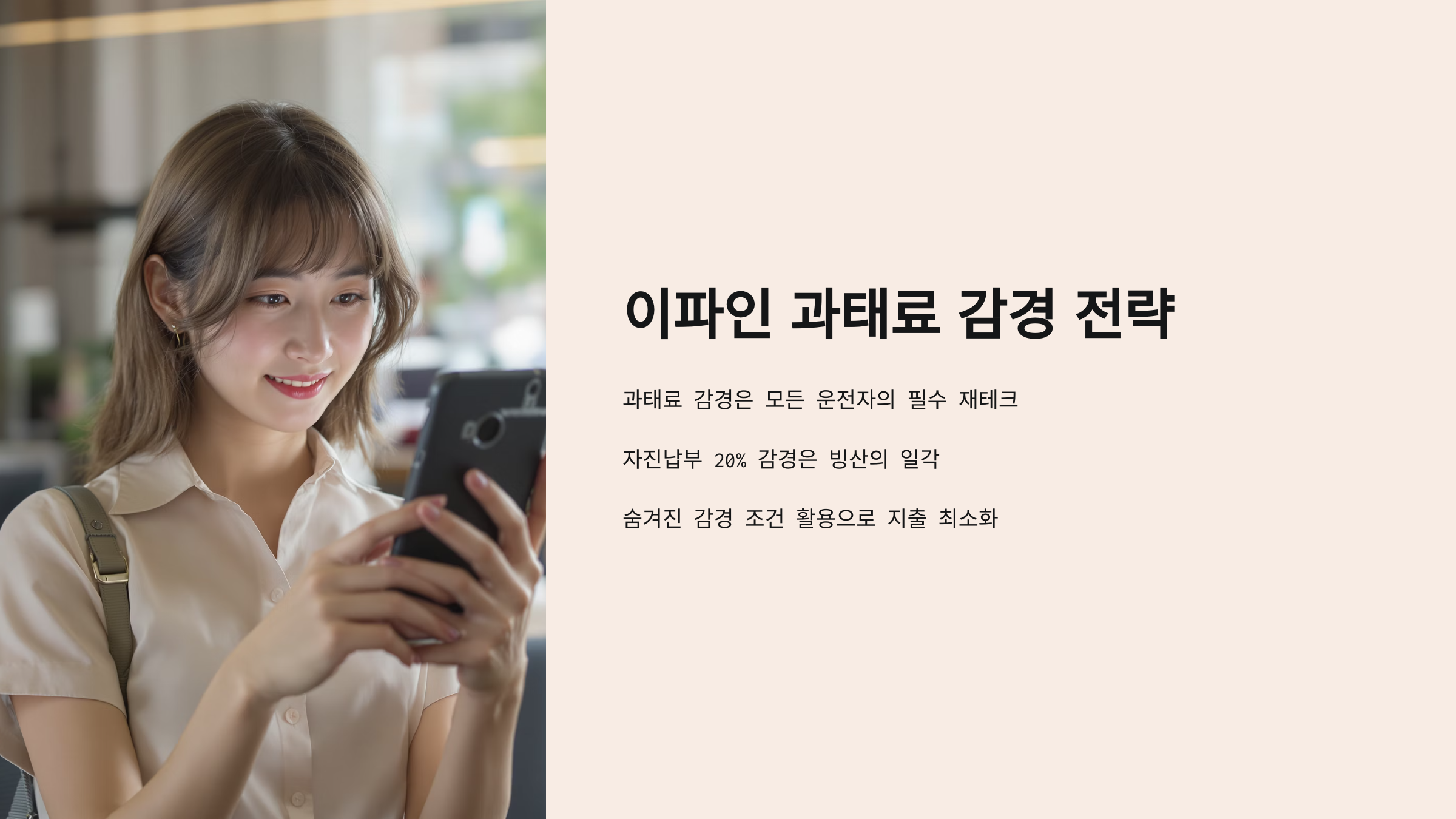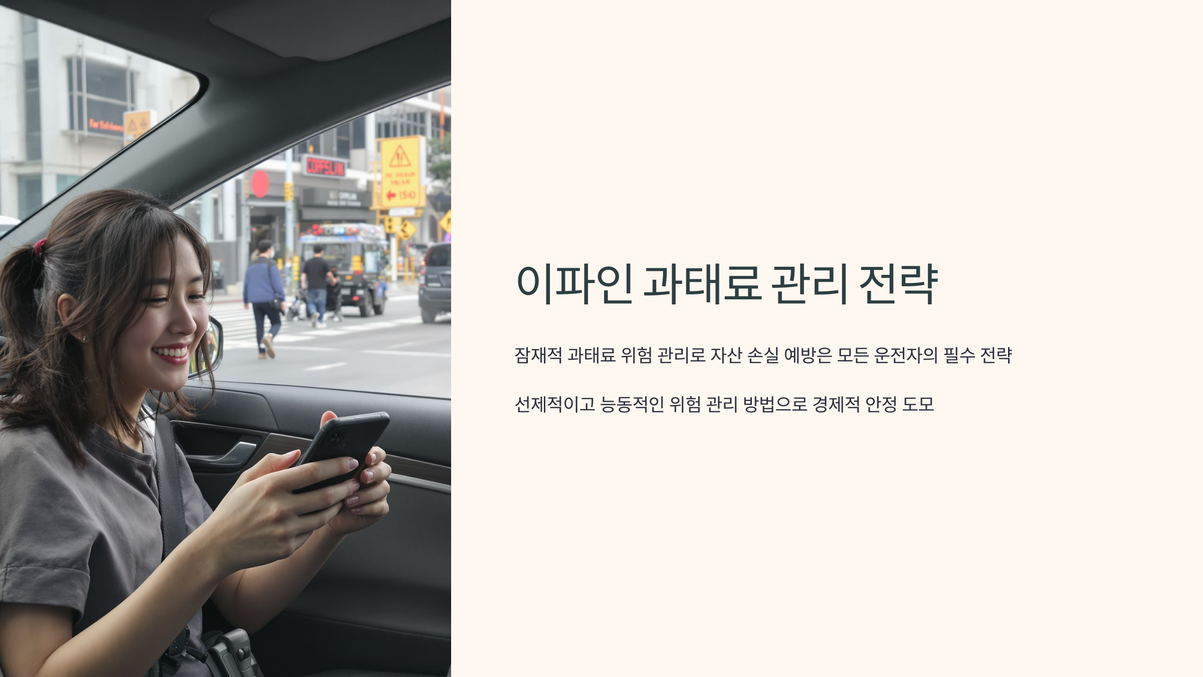 | 상시 관리 단계 | 예방적 조치 및 정보 습득 생활화 | 이파인 '착한운전마일리지' 신청/관리, 교통법규 상시 숙지, 차량 정기 점검, 이파인 알림 서비스 신청 | 과태료 발생 가능성 원천적 감소, 장기적 자산 보호 |