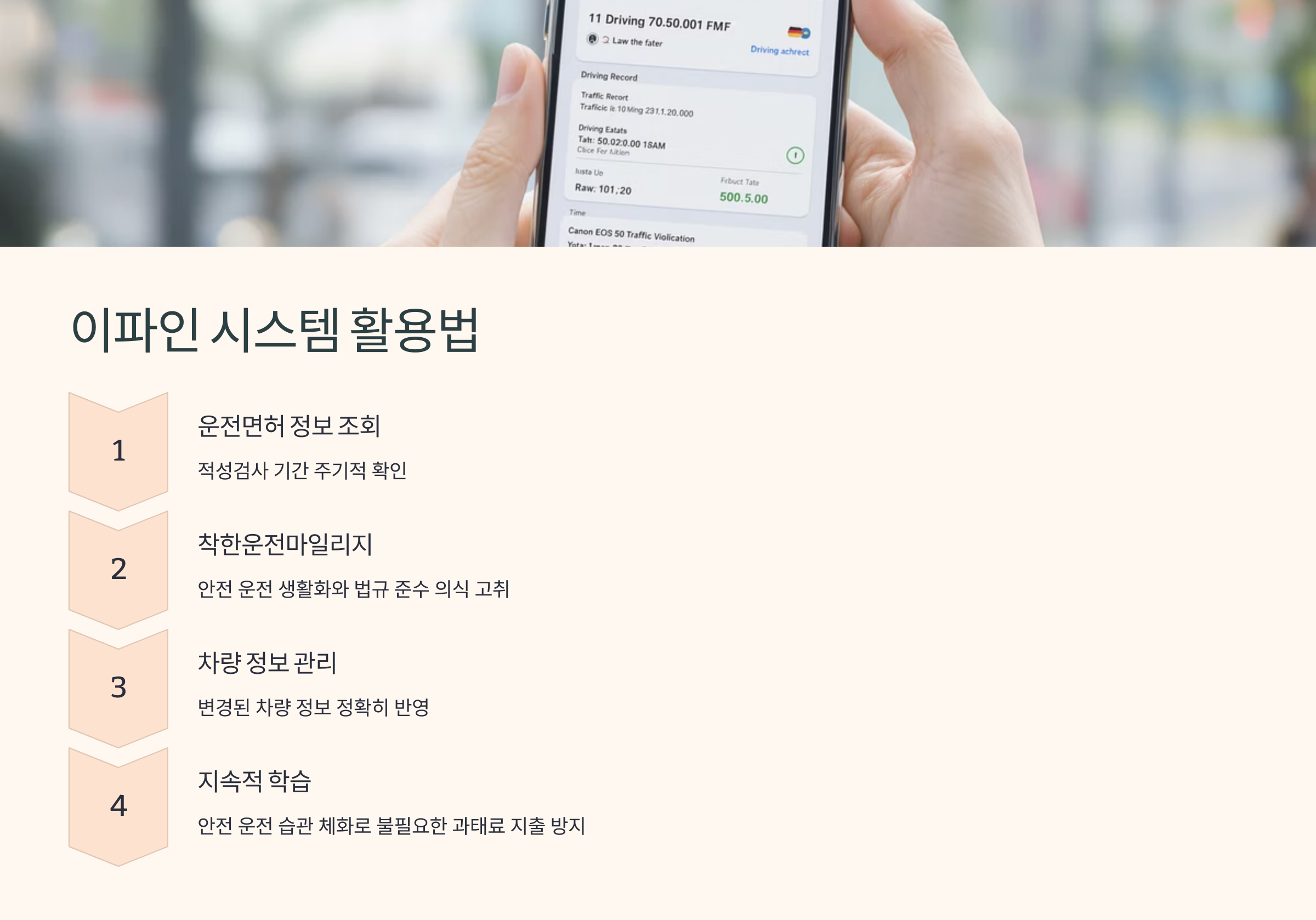 이파인 시스템은 주로 과태료 조회 및 납부, 면허 정보 확인 등의 사후 관리 도구로 인식되지만, 몇 가지 기능을 예방적 관점에서 적극 활용하면 잠재적 과태료 위험을 줄이는 데 효과적입니다. 단순한 기능 사용을 넘어, 이를 자신만의 위험 관리 시스템으로 구축하는 지혜가 필요합니다.
